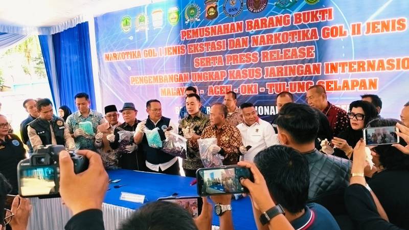 Pemusnahan tersebut dilakukan dalam kegiatan press release pengungkapan jaringan narkotika internasional yang digelar di halaman kantor BNNP Sumsel, Jumat (13/3/2026).
