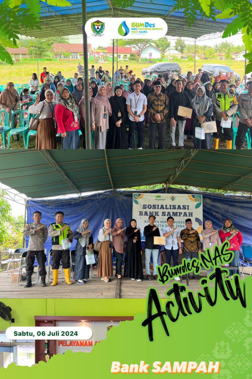 Sosialisasi Bank Sampah Bumdes Nas Activity Ekonomi Tumbuh Maju Desaku, itulah yang diharapkan serta dilakukan Bumdes Niru Anugerah Semesta Desa Tebat Agung, yang mana nantinya keberadaan sampah -sampah, baik itu sampah organik dan non organik dapat kita pilah-pilah menjadi emas melalui karya daur ulang sampah yang nantinya sampah dikelola menggunakan mesin sampah dengan hasil produk sampah yang berharga,”terang Dirut Bumdes Niru Anugerah Semesta Desa Tebat Agung Joshua Alfrilio Pratama