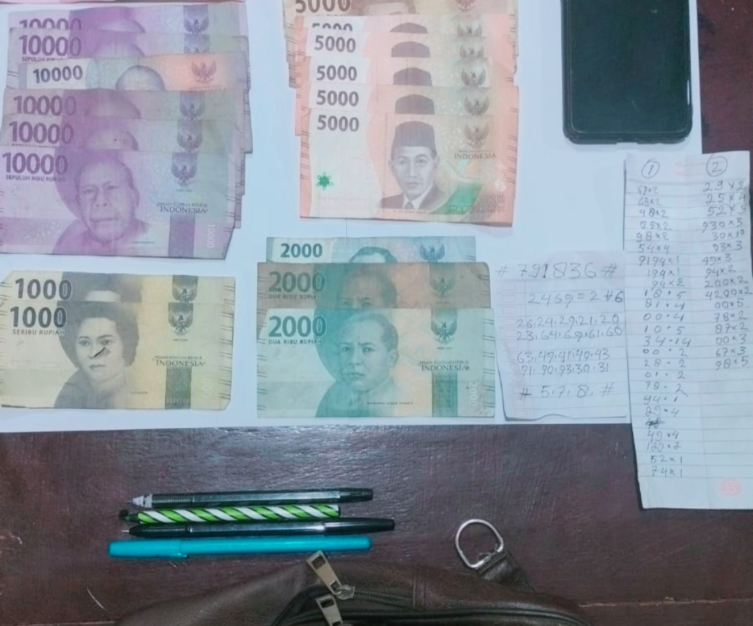Pada saat pemeriksaan dan penggeledahan, ditemukan beberapa barang bukti yang menjadi bukti kuat dalam proses penyidikan lebih lanjut. Barang bukti tersebut meliputi Uang tunai sejumlah Rp. 218.000, 1 unit handphone merk Oppo A3s warna hitam, 1 tas selempang warna coklat, 2 lembar kertas bertuliskan angka-angka dan 4 pena.